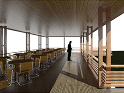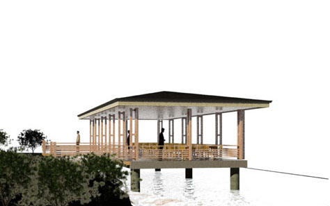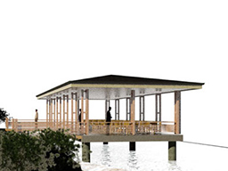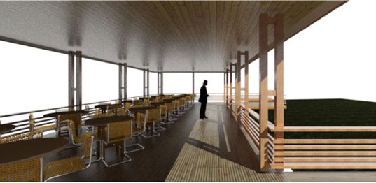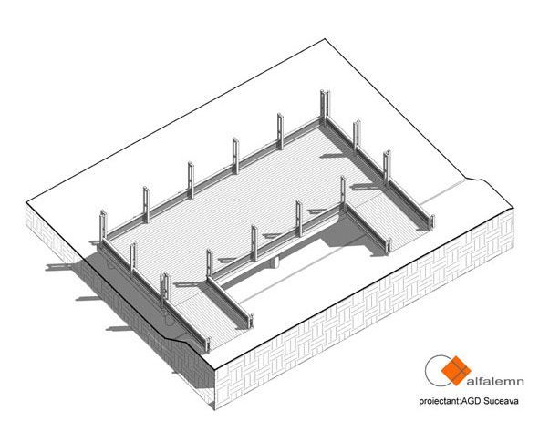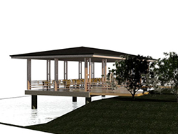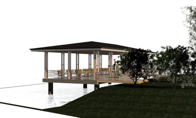 Terasa acoperita pe piloni din lemn impregnat deasupra apei sau pe teren.